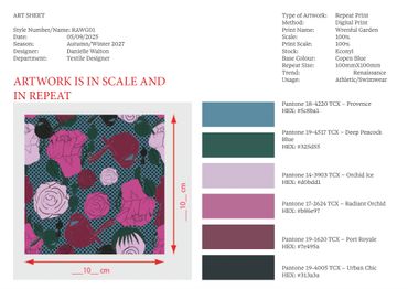 With access to WGSN and a physical copy of the Cotton Pantone Colour book, I stay connected and updated on current and future trends. I easily adapt brands aesthetic and create pieces of unique artworks to life for your textile needs. Having wide knowledge in the fashion industry, with attaining a Degree in Fashion along with real world experiences within the industry, I deliver on trend, brand matching, best selling textile repeat prints and placements. It is an absolute joy to have you here, please use the drop down box and select "get in touch" to book in our discovery call, or simple drop us an email. I look forward to hearing from you soon.